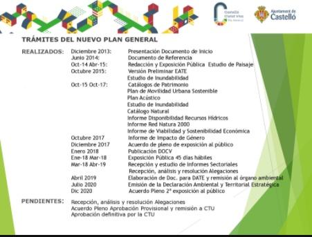 El equipo técnico que elabora el Plan General de Castelló espera en poder tener el documento completamente aprobado y en vigor dentro de 2021, y a poder ser, después del verano. Aunque los plazos no solo dependen del ayuntamiento sino de otras instituciones. Por esta razón, la entidad municipal habrá de solicitar la renovación de las Normas Urbanísticas Transitorias, para evitar los vacíos legales a partir de abril.