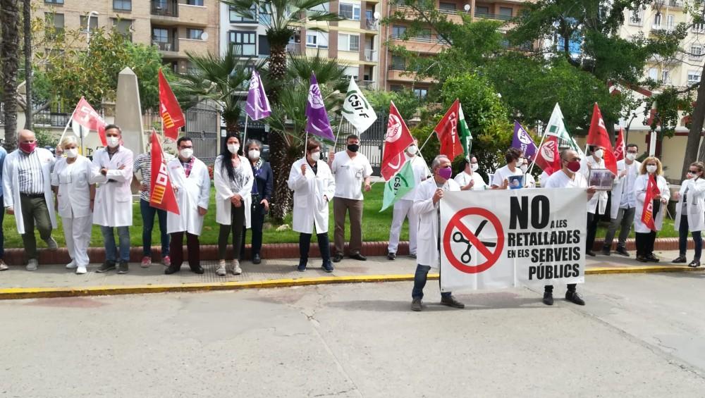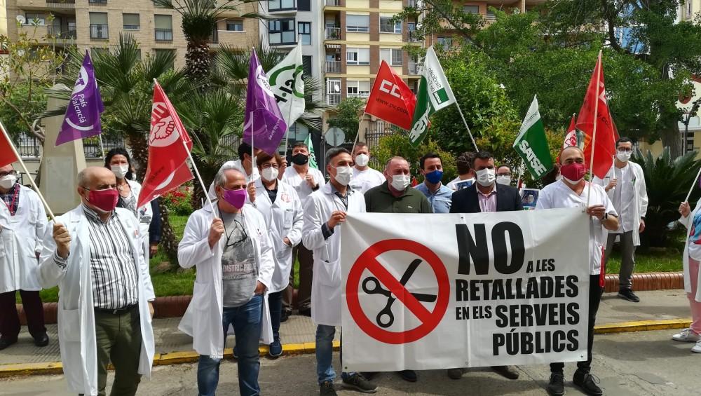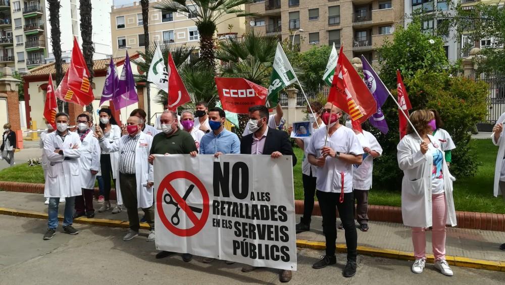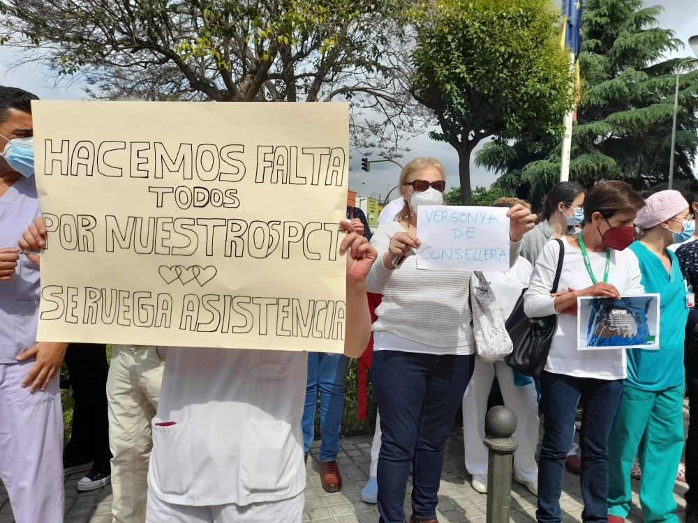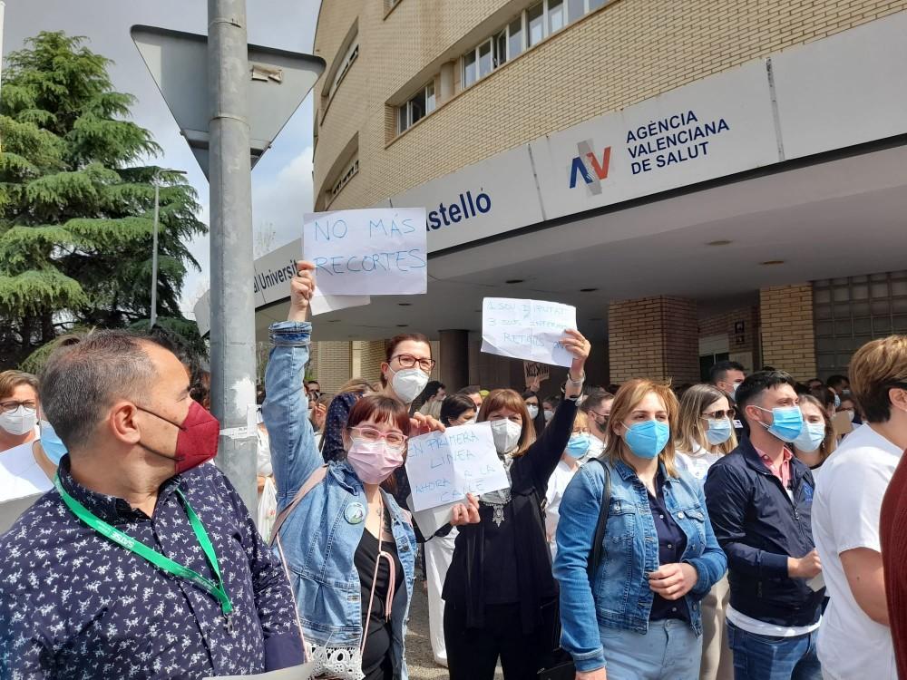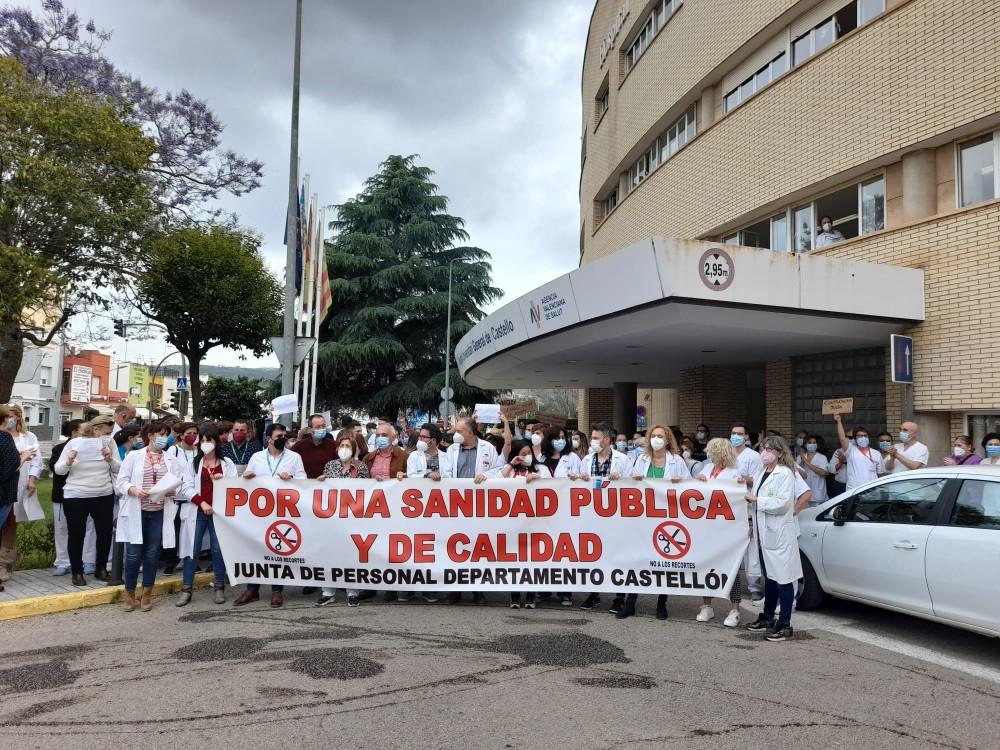 Más de un centenar de sanitarios del departamento de Salud de Castellón se han concentrado esta mañana frente al Hospital General Universitario y al Hospital Provincial para exigir la renovación de todos los contratos de refuerzo Covid. La protesta ha estado convocada por la Junta de Personal de Salud de Castellón.