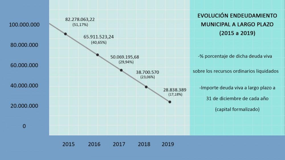 "La deuda viva a largo plazo del Ayuntamiento se ha situado en un 17,18%, un indicador mínimo que está muy lejos de los 129 millones que se alcanzaron en 2012, un año en el que el endeudamiento rozó el 90%", ha indicado Marco. La alcaldesa ha recalcado que este descenso progresivo de la deuda municipal se ha conseguido además "sin reducir las inversiones ni las políticas sociales en la ciudad", e "incluso bajando los impuestos", en referencia a la reducción de los valores catastrales solicitada por tercer año consecutivo y que ha situado a Castelló como una de las tres únicas capitales de provincia donde bajará el Impuesto de Bienes Inmuebles (IBI) en 2020.