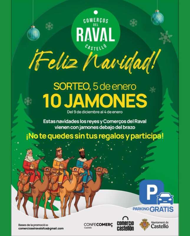 El barrio del Raval de Castelló ha anunciado el lanzamiento de una nueva campaña comercial destinada a dinamizar sus calles y apoyar a los pequeños establecimientos del distrito. La iniciativa, impulsada por Comerços del Raval y que cuenta con la colaboración del Ayuntamiento de Castelló, consiste en un sorteo de 10 jamones entre los clientes que realicen sus compras en los comercios asociados durante estas fiestas.