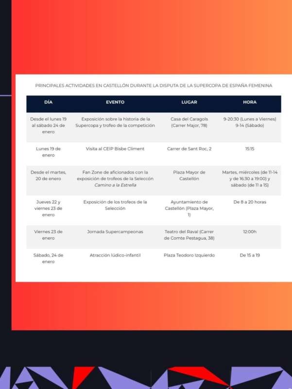 Entre esas propuestas destaca la exposición fotográfica de la Supercopa de España, que se podrá visitar en la Casa dels Caragols desde el 19 hasta el 24 de enero. A ello se suma la instalación de una Fan Zone, concebida como punto de encuentro abierto a toda la ciudadanía, que se ubicará en la plaza Mayor para vivir al máximo este acontecimiento deportivo. Además, en la plaza Teodoro Izquierdo habrá una atracción lúdico-infantil el día 24, de 15.00 a 19.00 horas.
