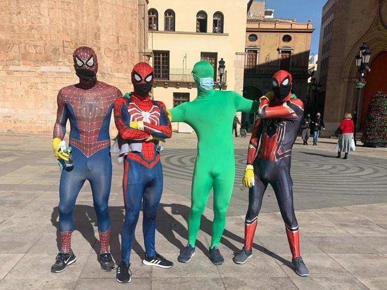 Tres hombres ataviados con el traje del superhéroe Spiderman han dejado ver este viernes por el centro de Castelló, concretamente en la plaza Mayor, para limpiar las calles de coronavirus, que estaba representado por otro componente del grupo, vestido totalmente de verde. Han realizado una performance que han podido contemplar los ciudadanos que transitaban en ese momento por la céntrica plaza.