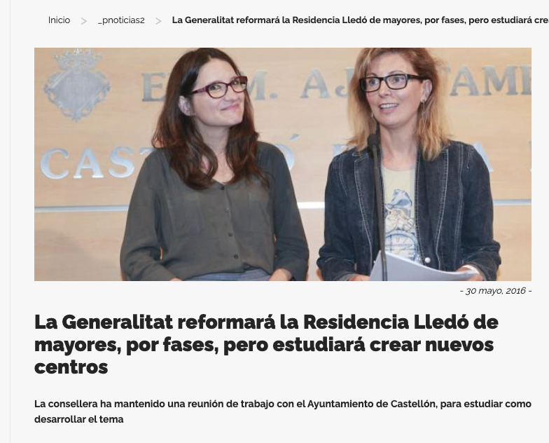 La vicepresidenta del Consell y consellera de Igualdad, Mónica Oltra y la alcaldesa de Castelló, Amparo Marco, se comprometieron en una reunión mantenida el 30 de mayo de 2016 a la creación de una nueva Residencia de Tercera Edad pública en la capital de la Plana. “La realidad, manifestaba entonces la alcaldesa, es que estamos en un proceso de envejecimiento poblacional y Castellón necesita más plazas en centros públicos para mayores, por lo que el Ayuntamiento y la Conselleria hemos iniciado las conversaciones para construir una segunda residencia en la ciudad de Castellón, ya que el ahorro en la reforma de Lledó se podría destinar a esta nueva edificación”.