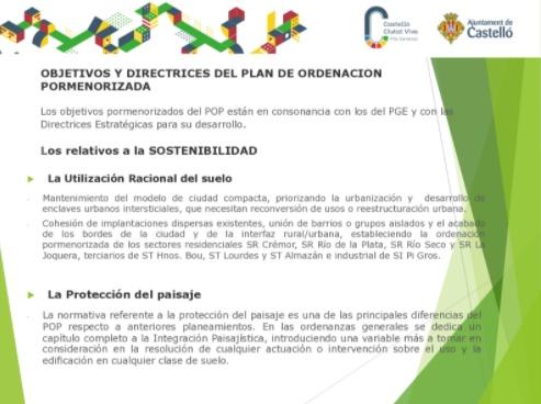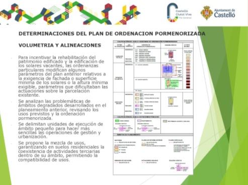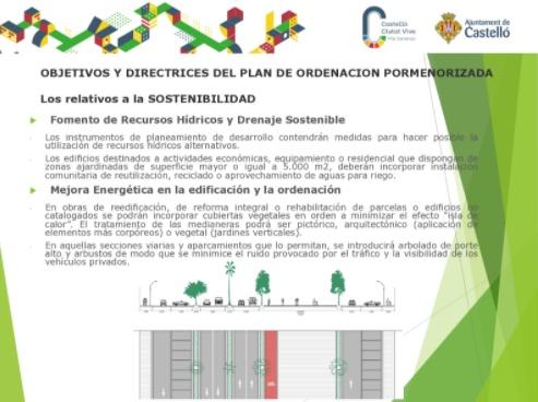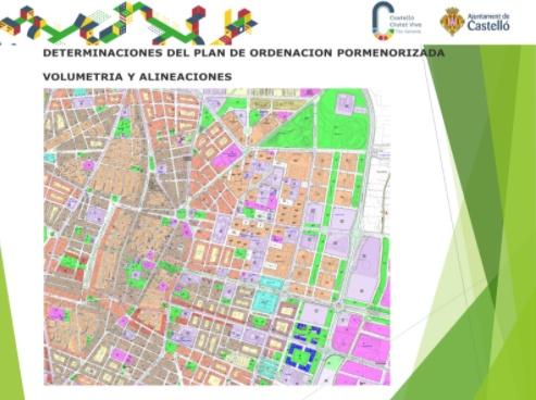 Los técnicos municipales han explicado hoy los pormenores del plan de Ordenación Pormenorizada desarrollado para Castelló, que prioriza un cambio de mentalidad dirigido a: promover el consumo energético, el ahorro de recursos hídricos y a promover una ciudad enlazada con conectores verdes. Las ordenanzas tienen a promover la compatibilidad de usos siempre que las actividades no sean contradictorias.