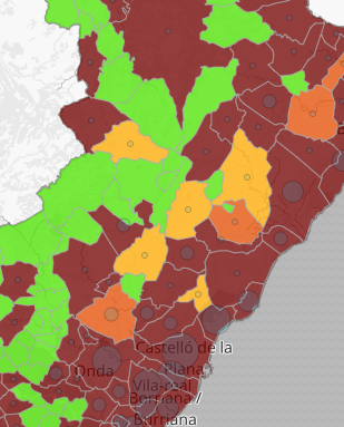 La situación es pareja en todo el territorio castellonense que se encuentra en riesgo extremo de la Covid-19 a excepción de algunos municipios de interior como Ayódar, Culla o Villahermosa que no tienen ningún contagio. Sin embargo, otras localidades como Morella (372,52 con 9 contagios), Montanejos (709,22 con 4 contagios) o Suera (2.290,08 con 12 contagios) si se encuentran en riesgo extremo aunque su número de contagios es menor.