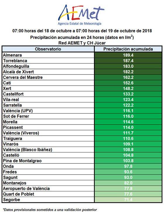 La provincia de Castellón se mantiene en alerta roja por el temporal que desde la jornada de ayer azota a la provincia de Castelllón y que se prevé se mantenga hasta media tarde de hoy viernes. Así, desde las 7 horas del jueves hasta las 7 de hoy se han registrado hasta 189, 4 litros por metro cuadrado en Almenara, 187,4 l/m2 en Torreblanca, 183 l en Alfondeguilla y  182, 2 en Alcalà de Xivert, siendo estas las localidades en las que más precipitaciones se ha registrado. En la capital de La Plana se han acumulado hasta 104,8 litros durante estas 24 horas y en Vila-real 123,4 litros. El Consorcio Provincial de Bomberos ha atendido hasta las 8 horas de hoy más de 25 intervenciones por vehículos atrapados y varias urbanizaciones inundadas en Alcalà.