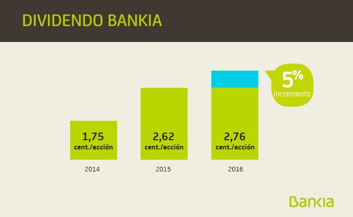 Bankia abona hoy un dividendo en efectivo de 2,756 céntimos de euro brutos por acción con cargo a los beneficios obtenidos en el ejercicio 2016, lo que supone un incremento del 5% respecto a la cuantía repartida el año precedente.