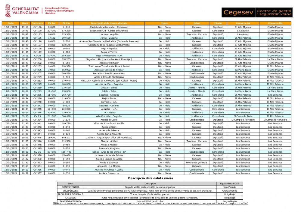 La situación de las carreteras en la provincia de Castellón sigue siendo complicada tras el paso de la borrasca Filomena durante la jornada de este lunes, según ha informado la Conselleria de Política Territorial, Obras Públicas y Movilidad. El listado que a continuación publicamos es el que ha hecho público esta mañana la Conselleria y que corresponde al estado de las carreteras desde la tarde del domingo y la mañana de este lunes, por lo que la situación puede ir variando durante la jornada.