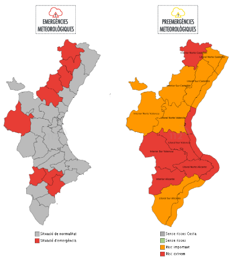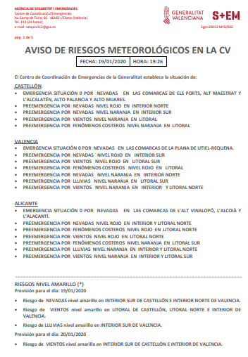 La Agencia de Seguridad y Emergencias de la Generalitat ha emitado un comunicado a última hora de esta tarde en el que se señala que el Centro de Coordinación de Emergencias establece para la provincia de Castellón la situación de Emergencias situación 0 por nevadas en las comercas de Els Ports, Alt Maestra, l'Alcalatén, Alto Palancia y Alto Mijares. Además, establece nivel de preemergencia por nevadas con nivel rojo en el interior norte, el nivel naranja en el interior sur, la preemergencia por vientos en nivel naranja en el litoral y la preemergencia por fenómenos costeros nivel naranja en el litoral.