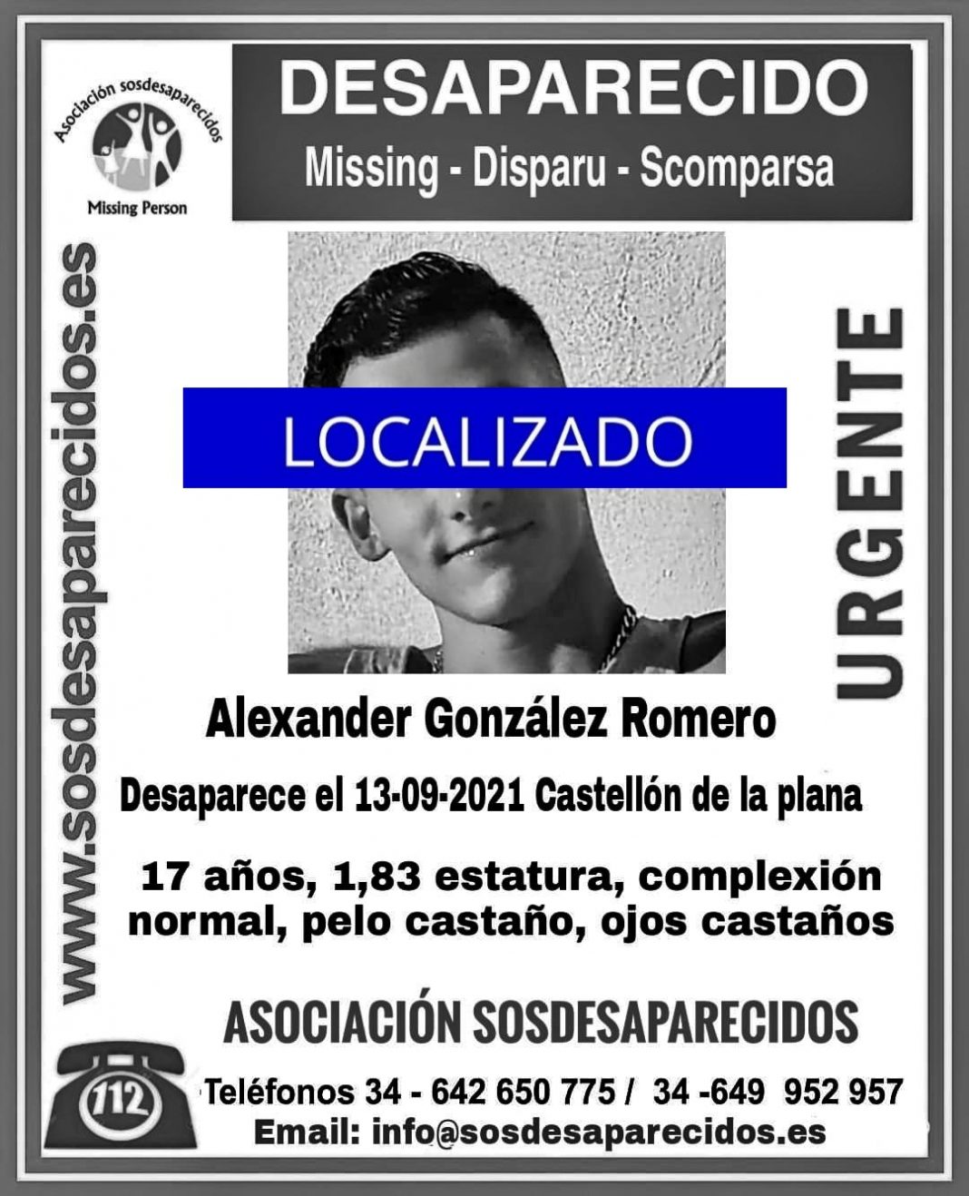 La Asociación SOS Desaparecidos lanzaba esta mañana un llamamiento para tratar de localizar a Alexander González Romero, un joven menor de edad de 17 años que desapareció este pasado lunes de su domicilio en Castelló de la Plana. De complexión normal y pelo castaño, buscado desde que no haya acudido a casa esta pasado noche.