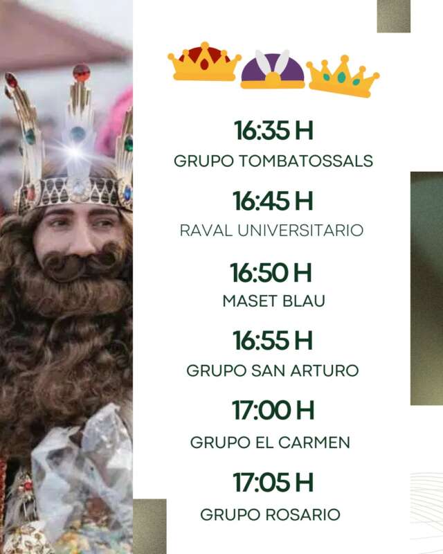 De manera simultánea, a partir de las 16:10 horas, los barrios de la ciudad contarán con la presencia de Reyes Magos que pasarán en vehículos descapotables por el Grupo Benadresa, Grupo Venta Rosita, Grupo Venta Nova, Grupo Reyes, Grupo Roser, Grupo San Agustín y San Marcos, Grupo Tombatossals, Grupo Rafalafena Universitari, Maset Blau, Grupo San Arturo, Grupo El Carmen, Grupo Rosario, Grupo San Lorenzo, Grupo Lourdes, Grupo San Andrés, Grupo San Bernardo y Grupo Roquetes.