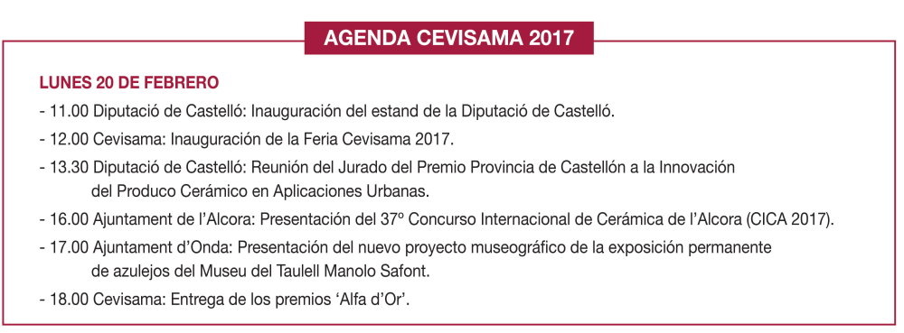 Por otra parte, la Diputación de Castellón ha cerrado una completa agenda de trabajo en Cevisama para “convertir la mayor cita del sector cerámico en el mejor escenario en el que el azulejo castellonense pueda seguir sumando buenas noticias para el tejido económico, laboral y social de la provincia”. Para ello dispondrá de un stand propio en Feria Valencia, en el que habrá numerosas presentaciones y reuniones de todo tipo.