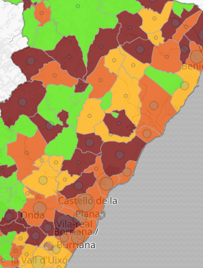 Siguen esta línea otros municipios del departamento de Castelló. La capital de la provincia logra teñirse de naranja y pasar de riesgo extremo a alto con 440,14 (-169,85) puntos. Del mismo modo, otras localidades como Orpesa ( 385,48), Benicàssim (392,07) o Almassora (332,81) pasan a riesgo alto.