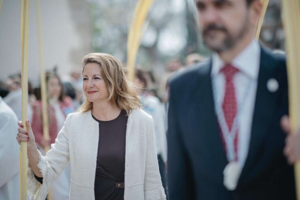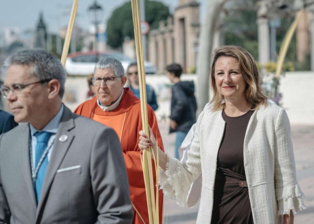 La alcaldesa de Castellón, Begoña Carrasco, acompañada por el concejal de Relaciones Institucionales, Vicent Sales, ha asistido esta mañana a la tradicional bendición y misa del Domingo de Ramos que se ha celebrado en la Basílica del Lledó, presidida por su prior Joaquín Guillamón.