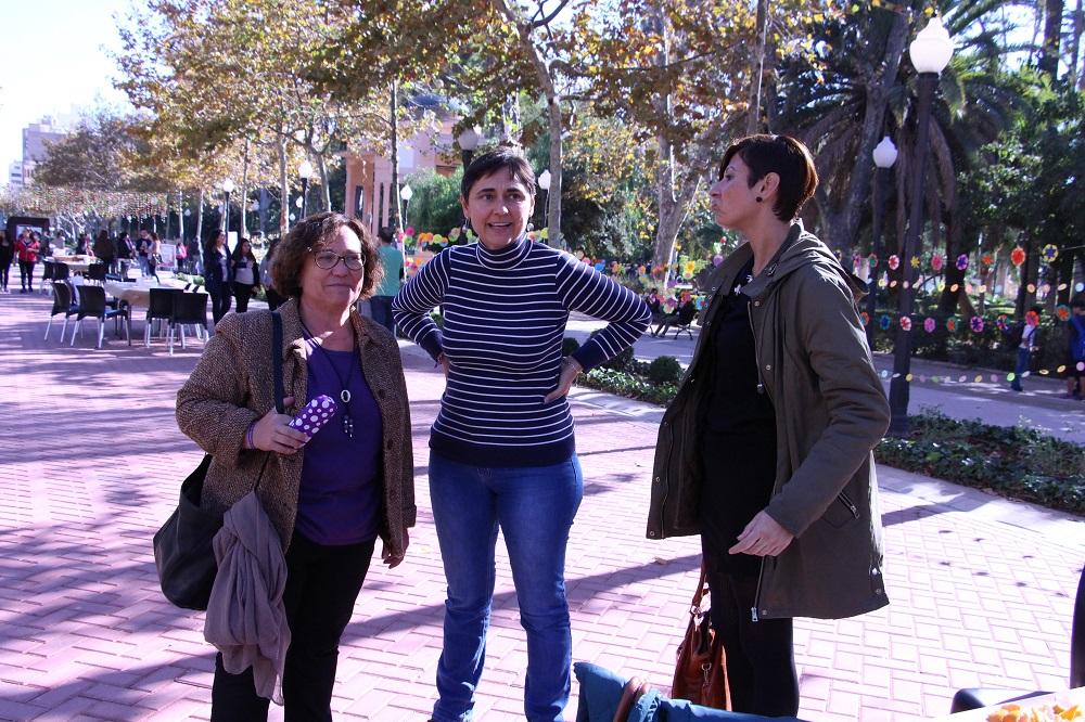 La edila de Igualdad se ha implicado en todos los trabajos que han llevado a cabo los colectivos y ha visitado las diferentes mesas en las cuales había grupos de mujeres y hombres haciendo flores de papel para continuar adornando el parque. Al respeto, ha recordado su propia implicación en los talleres, en los que ha participado en las últimas semanas. La iniciativa 'Juega tu papel para parar la violencia machista' ha contado, además, con la emotiva actuación del grupo 'La finestra', que promueve espectáculos teatrales para conseguir la transformación social. La emotiva actuación, titulada 'La cotidianidad?' ha conmocionado a las decenas de asistentes con una narración basada en los asesinatos de las mujeres. Las actrices han ido escenificando lo que supone que cada vez más mujeres resultan asesinadas a manos de sus parejas.