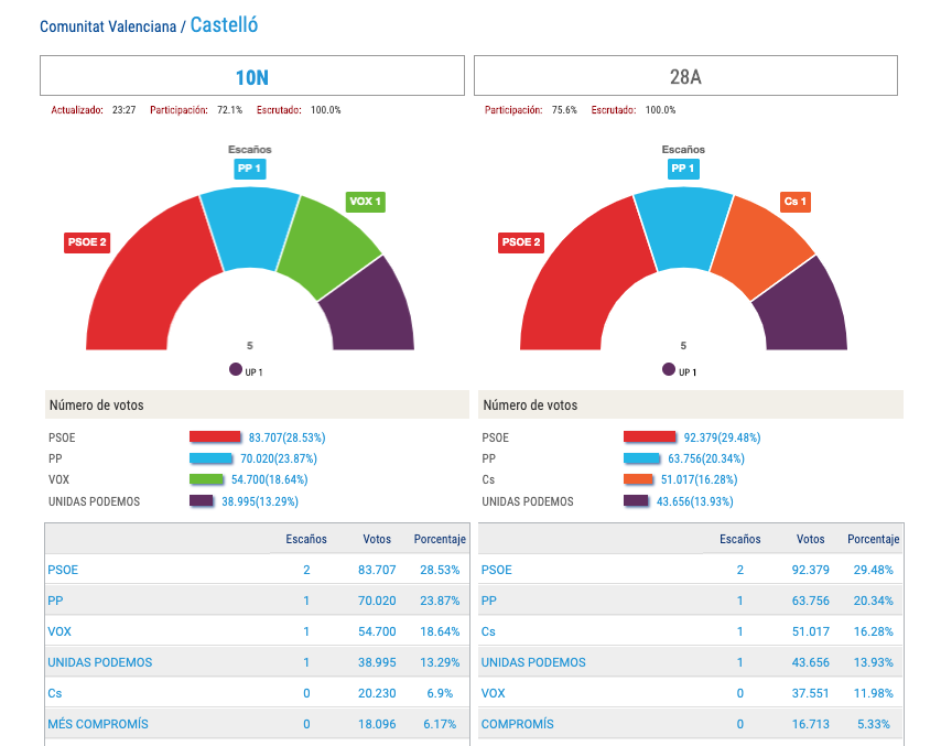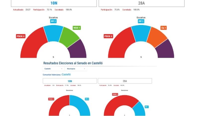 Las elecciones del 10 han vuelto a dar la victoria al PSPV-PSOE en Castellón, que repite sus dos diputados y saca a su vez dos representantes en el Senado. El Partido Popular mantiene su escaño en el Congreso pero ha logrado dos senadores, uno más que el pasado 28 de abril. En el Congreso, Podem repite también el escaño que tenía, y Vox se adjudica el último, que pierde Ciudadanos.