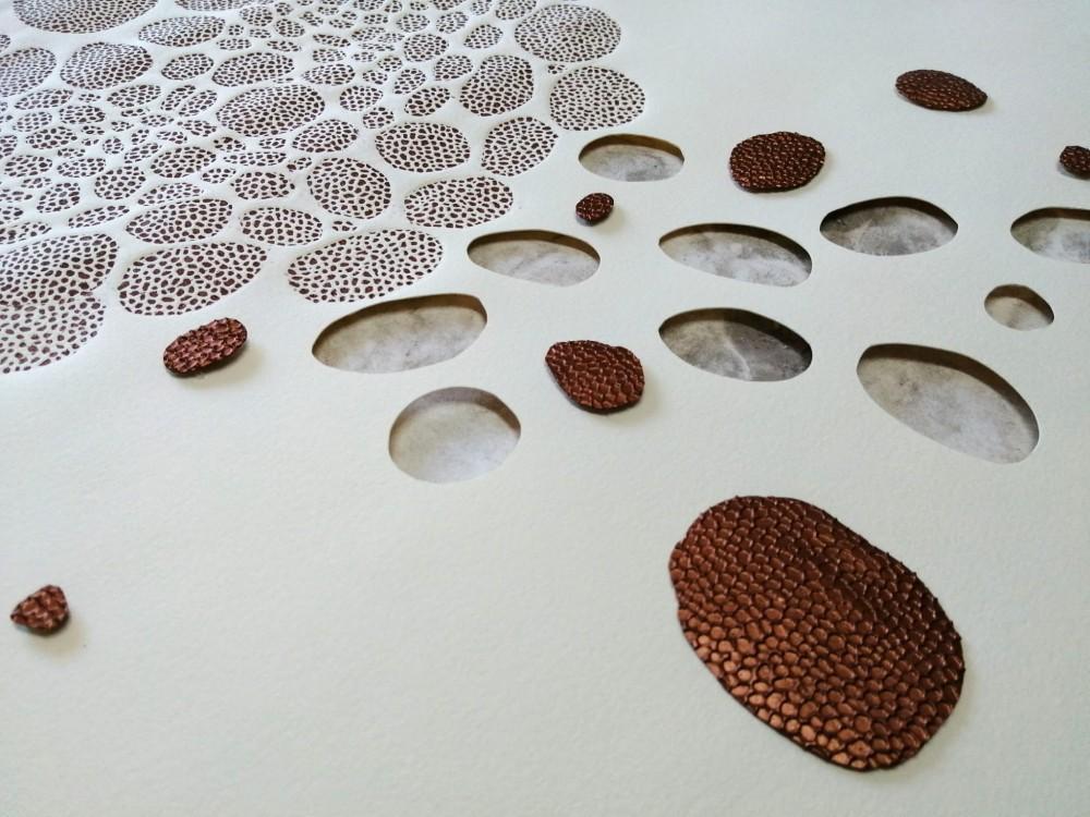 La artista en ese momento apelaba a lo sensorial, previo vaciado de todo contenido contaminante, siendo éste el planteamiento al abordar la obra, trasladando esos estímulos a los diferentes soportes por medio de las distintas técnicas y fieles a su plasmación. El proyecto conjuga una serie de elementos entre lo vegetal y lo fósil, lo celular o lo estelar, conformadores de sistemas, siguiendo un patrón no ajeno a lo fractal.