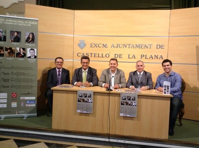 El concejal de Cultura del Ayuntamiento de Castellón, Vicent Sales, junto al alcalde de Xilxes, Vicente Martínez; el diputado de Cultura, José Luis Jarque; José Vicente Ramón, en representación de la Fundación Dávalos Fletcher; y Alberto Agut, en representación de L’Orfeu Musical, ha presentado hoy el I Festival de Música de Cámara que ofrecerá cuatro conciertos con un cuarteto de Música de Cuerda –formado por primeras figuras de la escena internacional como los violines de Marketa Janouskova y Kohta Nomura, Paul Beckett a la viola y Chul Geun-Park al cello, del 31 de mayo al 3 de junio en el Auditorio de Castellón (11.30 horas), el Casino Antiguo (20.00 horas), el Auditorio de Xilxes (20.00 horas) y el Conservatorio Superior de Música Salvador Seguí de Castellón (13.00 horas). Y a este cuarteto su sima el propio Alberto Agut al clarinete y Arcadie Triboi al piano. “Los conciertos se basan en música de cámara, en quintetos, tríos y un ensemble orquestal y con cuatro programaciones distintas para disfrutar de un repertorio variado”, ha dicho Agut.