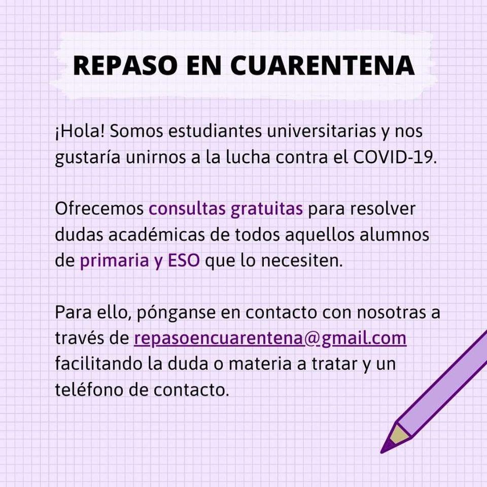 Docentes de infantil, primaria y secundaria se ofrecen en este grupo para aportar material, a través de esta red social, con el objetivo de que los niños y niñas que en estos momentos se encuentran en sus casas por obligación puedan realizar algunas de las manualidades o ejercicios que estos maestros y profesores comparten en el grupo. Hay algunos que también ofrecen dar clases por Skype de forma gratuita para aquellos que lo soliciten o resolver dudas a los estudiantes durante este periodo de confinamiento.