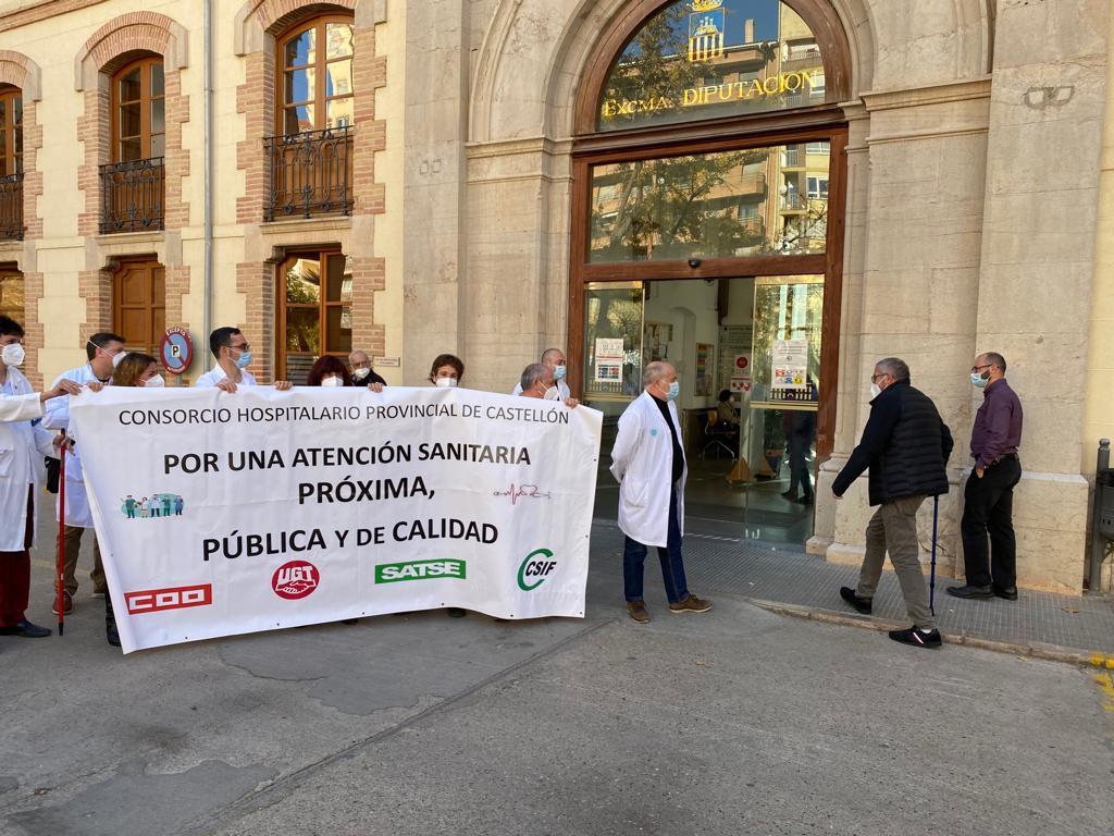 Representantes de los sindicatos que forman parte de la Mesa General de Negociación del Hospital Provincial de Castellón, esto es, CC.OO., UGT, SATSE y CSIF, se han concentrado hoy en la puerta principal de la instalación para protestar por la “falta de información y de soluciones” por parte del Consell para garantizar la viabilidad del Consorcio.