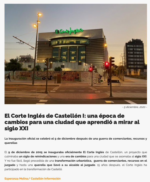Miércoles, 9 de diciembre: “El Corte Inglés de Castellón V: El gigante comercial presentó su proyecto en 2003, se inauguró en 2005”. Esta última entrega recoge los detalles de la presentación del proyecto y también, como y cuando se inauguró. Analiza también algunos detalles interesantes, sobre la burbuja inmobiliaria de la zona oeste, y las consecuencias de la modificación urbanística, que generaría, años después, la anulación del Plan General.