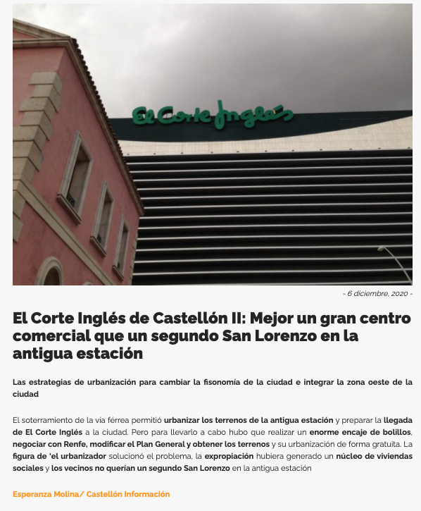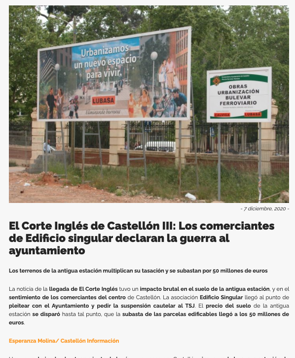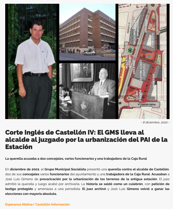 Martes, 8 de diciembre: “El Corte Inglés de Castellón IV: El GMS lleva al alcalde al juzgado por la urbanización del Pai de la Estación”. Se aportan los detalles de la querella, y todo aquel proceso, incluido la solicitud de un testigo protegido.