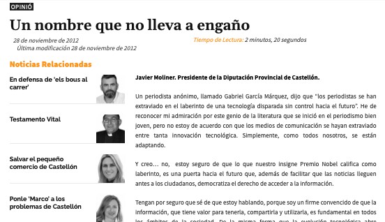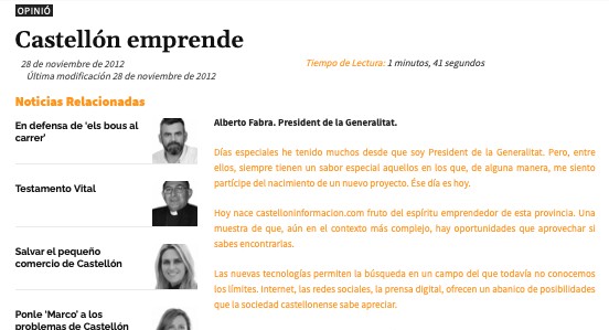 Estas fueron las opiniones de apoyo que publicaron el presidente de la Generalitat, Alberto Fabra 'Castelló emprende'; el presidente de la Diputación, Javier Moliner, 'Un nombre que no lleva a engaño'; y el alcalde de Castellón, Alfonso Bataller, 'bienvenidos y suerte'.