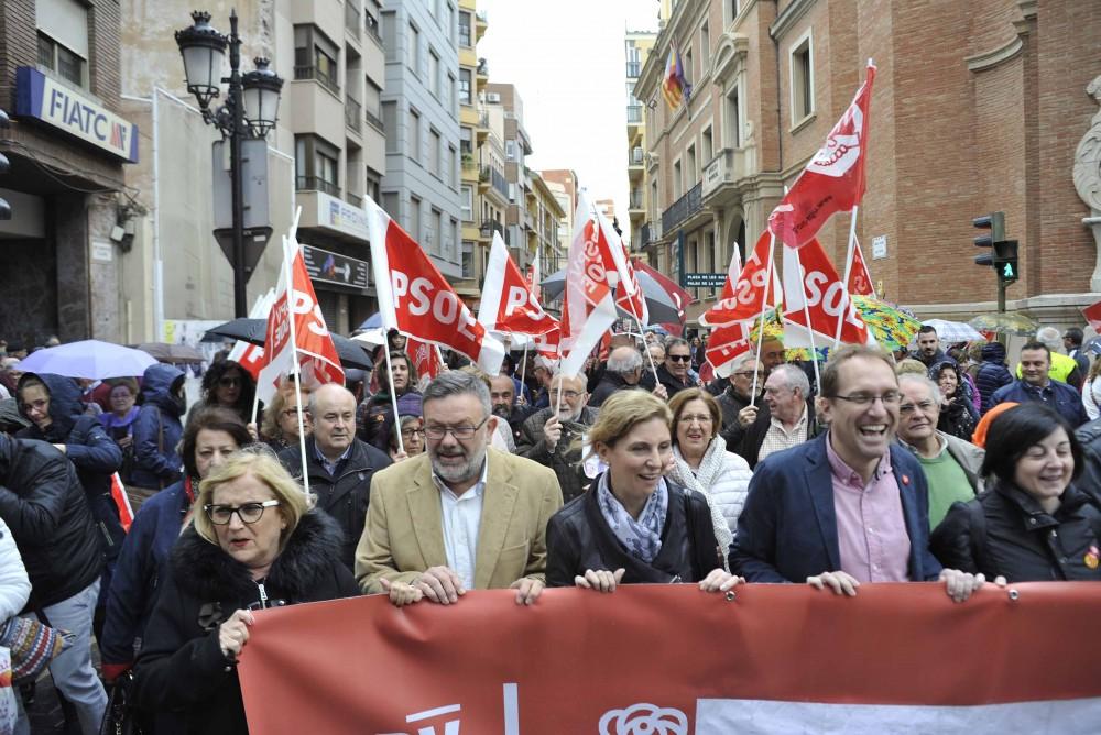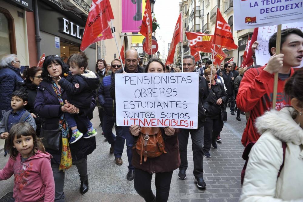 Cinco mil personas, según datos de la Policía Local, y 9.000 participantes según cifras de los sindicatos, han asistido esta mañana a la manifestación por unas pensiones dignas. Tanto los sindicatos CC OO, UGT, como La Unió, y partidos como PSOE, Compromís y CseM han participado en la multitudinaria marcha que ha partido desde la plaza Mayor para llegar hasta la plaza María Agustina donde se ha leído un comunicado contra la subida del o,25% decretada por el Gobierno de Rajoy