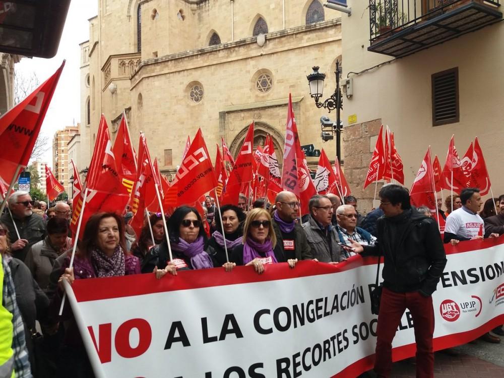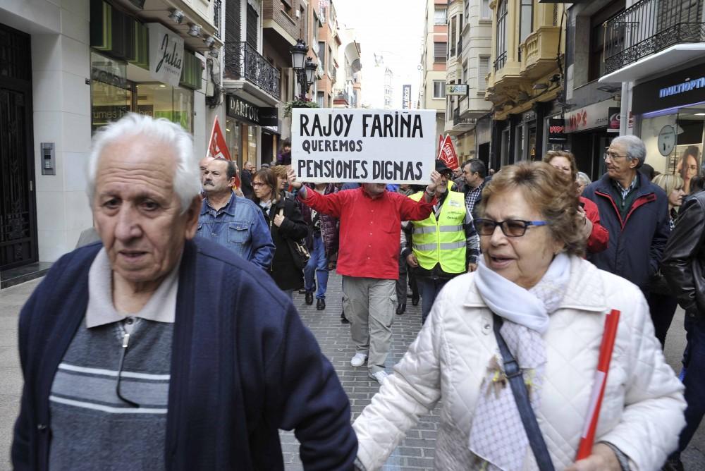 Cinco mil personas, según datos de la Policía Local, y 9.000 participantes según cifras de los sindicatos, han asistido esta mañana a la manifestación por unas pensiones dignas. Tanto los sindicatos CC OO, UGT, como La Unió, y partidos como PSOE, Compromís y CseM han participado en la multitudinaria marcha que ha partido desde la plaza Mayor para llegar hasta la plaza María Agustina donde se ha leído un comunicado contra la subida del o,25% decretada por el Gobierno de Rajoy
