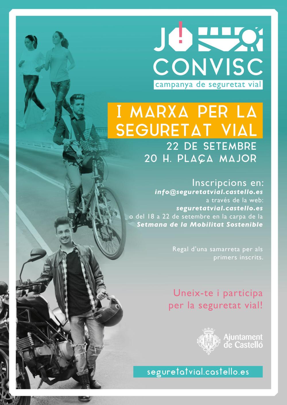 Castellón convoca una marcha a pie por la seguridad vial con el objetivo de reivindicar una movilidad urbana respetuosa y compartida que vele especialmente por la seguridad de los usuarios más vulnerables: peatones, ciclistas y motoristas. La marcha, incluida en la campaña institucional de seguridad vial #JoConvisc, se celebrará el próximo viernes, 22 de septiembre, a las 20:00 con salida y llegada a la plaza Mayor. Las primeras 200 personas que se inscriban conseguirán una camiseta.