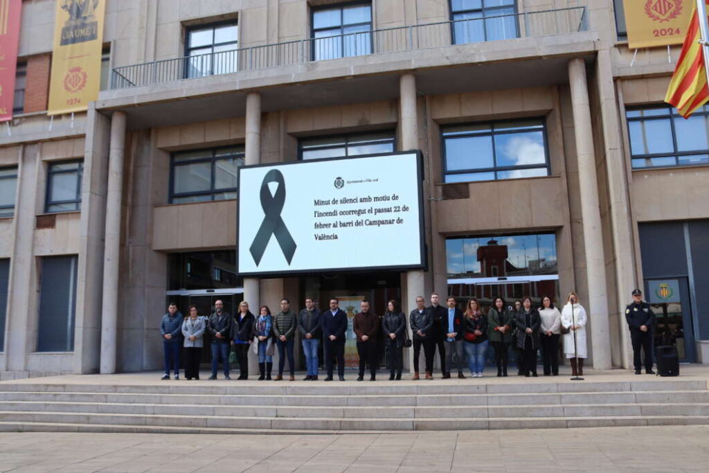 La corporación municipal de Vila-real, presidida por el alcalde, José Benlloch, ha guardado hoy un minuto de silencio -convocado por la FVMP- en señal de respeto y pésame por las víctimas y los afectados del incendio del barrio del Campanario de València. "Es un momento de mucho de dolor; de parte de la corporación municipal y de toda la ciudadanía de Vila-real, toda nuestra solidaridad con los afectados y nuestro agradecimiento en los cuerpos y fuerzas de seguridad y de emergencias, así como a la solidaridad de todos los valencianas y valencianas que se han volcado en este drama", ha señalado Benlloch, quien ha convocado a la ciudadanía a secundar también en el minuto de silencio que ha convocado la FEMP lunes a las 12 horas y que el Ayuntamiento de Vila-real celebrará a las puertas del consistorio. Benlloch ha dictado luto oficial en Vila-real hasta el lunes y las banderas oficiales ondean a media asta.