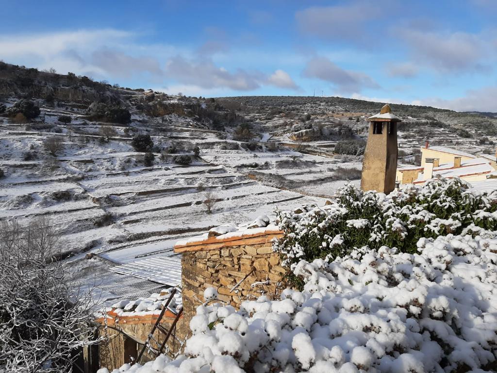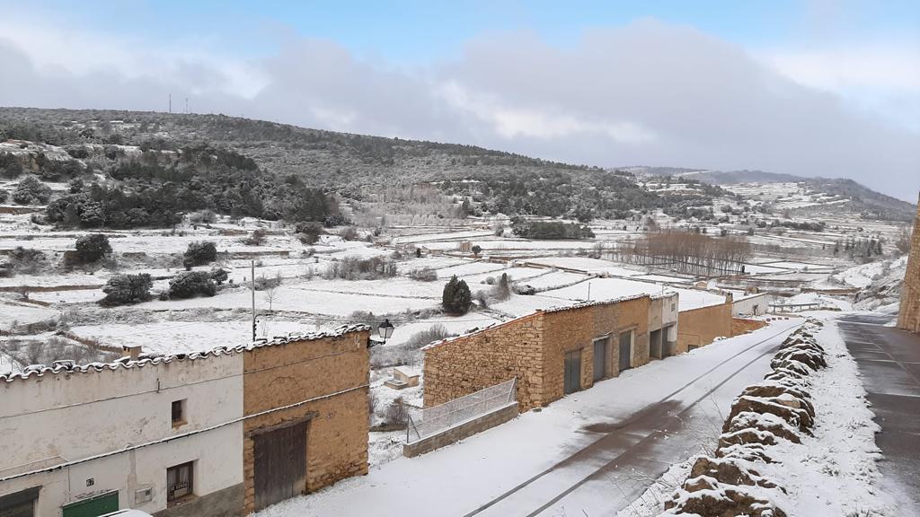 El primer día del año 2021 ha comenzado con nieve en el interior de la provincia de Castellón. Localidades como Vilafranca, Castellfort, Vistabella o Morella muestran una imagen invernal.