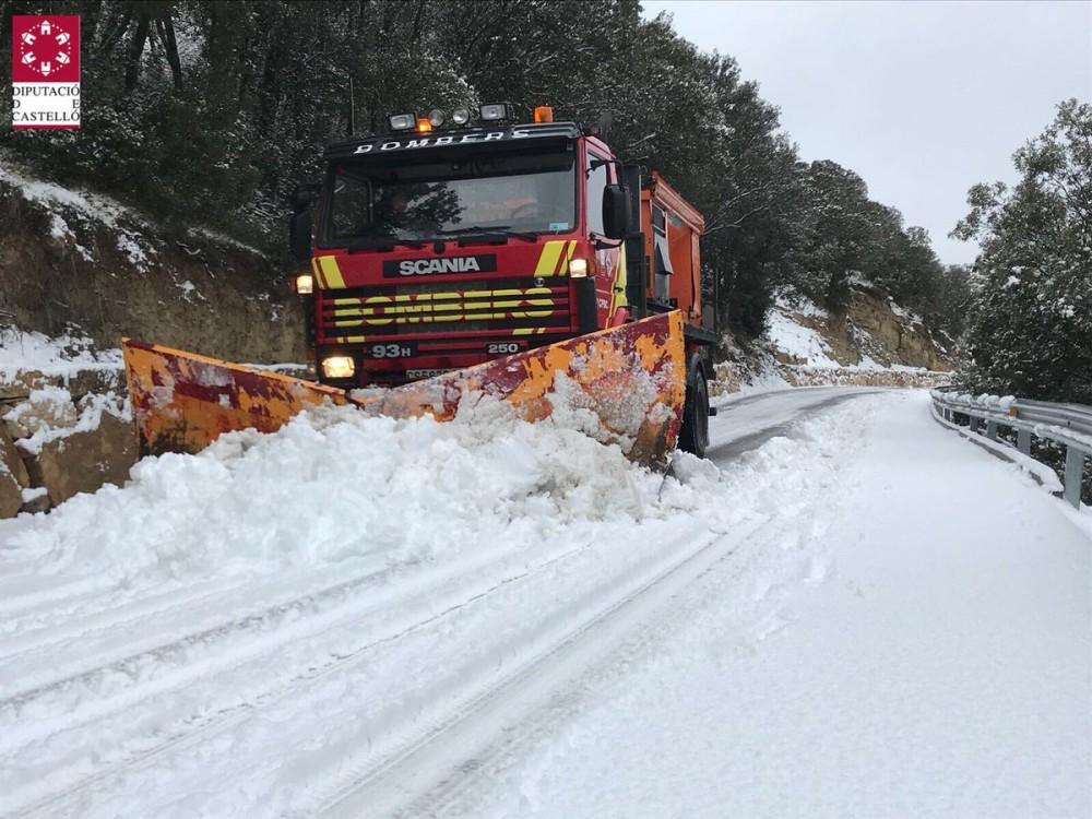 El Consorcio Provincial de Bomberos de Castellón tiene movilizados un total de 9 equipos quitanieves en el interior de la provincia. Los mayores acumulados de nieve están en zona de Vistabella y una parte de la Tinença de Benifassà (sobre 10cm). En el resto se actúa en placas de hielo y algún punto con nieve.