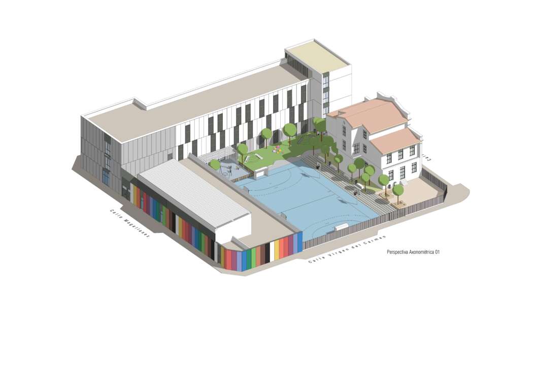 El nuevo centro, que integrará el icónico edificio del Reloj, contará con un único edificio en forma de ‘L’, dando fachada a la calle Trafalgar y a la calle Magallanes. El cuerpo que da frente a la calle Trafalgar contiene el aulario y la zona de administración, mientras que en el que da a la calle Magallanes se sitúan el gimnasio, la cocina y el comedor.