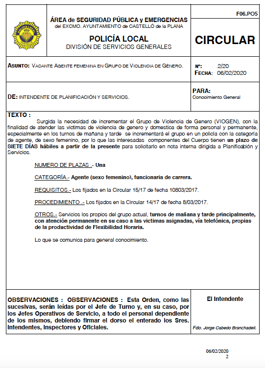 Referencia: Circular 2/2.020 de 6 de febrero de 2.020, de vacante de agente femenina en Grupo de Violencia de Género.