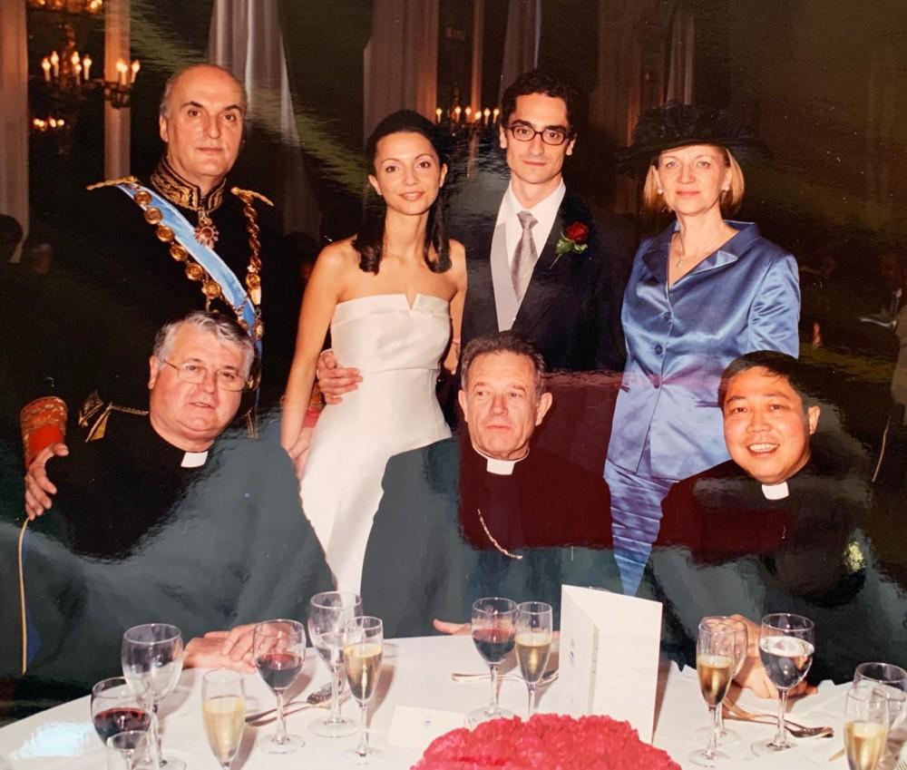 Pie de Foto: Jorge Fuentes junto al Monseñor Bernardito, nuevo Nuncio de España, el Monseñor Faustino Sainz y Don Luis Lezama, en la boda de Laura Fuentes, la hija del Embajador de España, en Madrid en 2002.