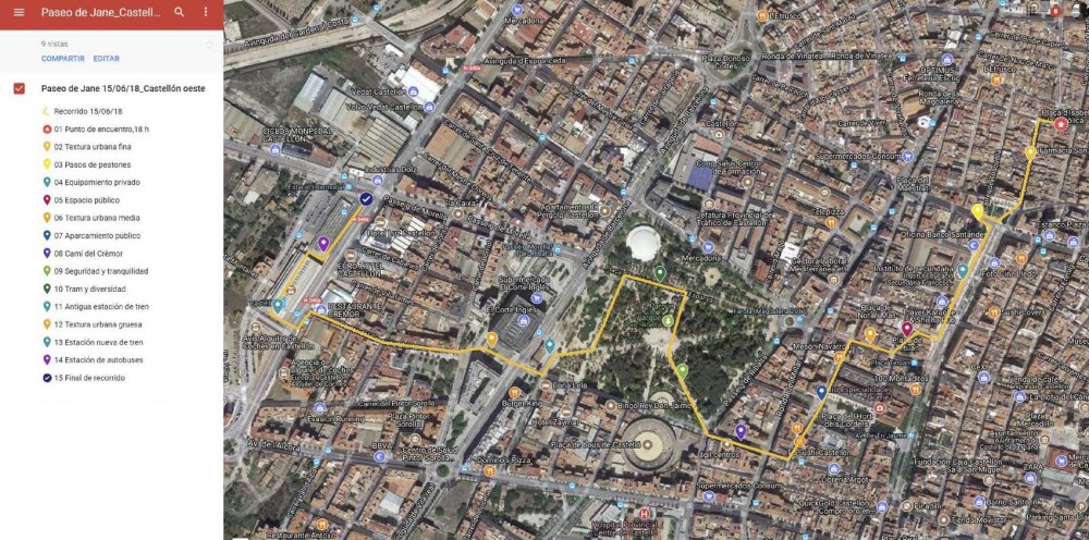 El recorrido arrancará a las 18.00 horas en la plaza Isabel la Católica (popularmente conocida como Plaça l’Ereta) y concluirá en la estación de tren después de recorrer el Raval de Sant Fèlix, la avenida rei en Jaume, plaza Tetuán, avenida Pérez Galdós y parque Ribalta. El concejal de Ordenación del Territorio, Rafa Simó, explica que se trata del primer Paseo de Jane después de que la Conselleria de Vertebración del Territorio premiara al Ayuntamiento de Castellón por la introducción de la perspectiva de género en el Plan General, del que se valora, entre otras cosas, la innovación metodológica de integrar la perspectiva de género desde el inicio de los trabajos de la planificación urbanística y en el diseño de la ciudad.