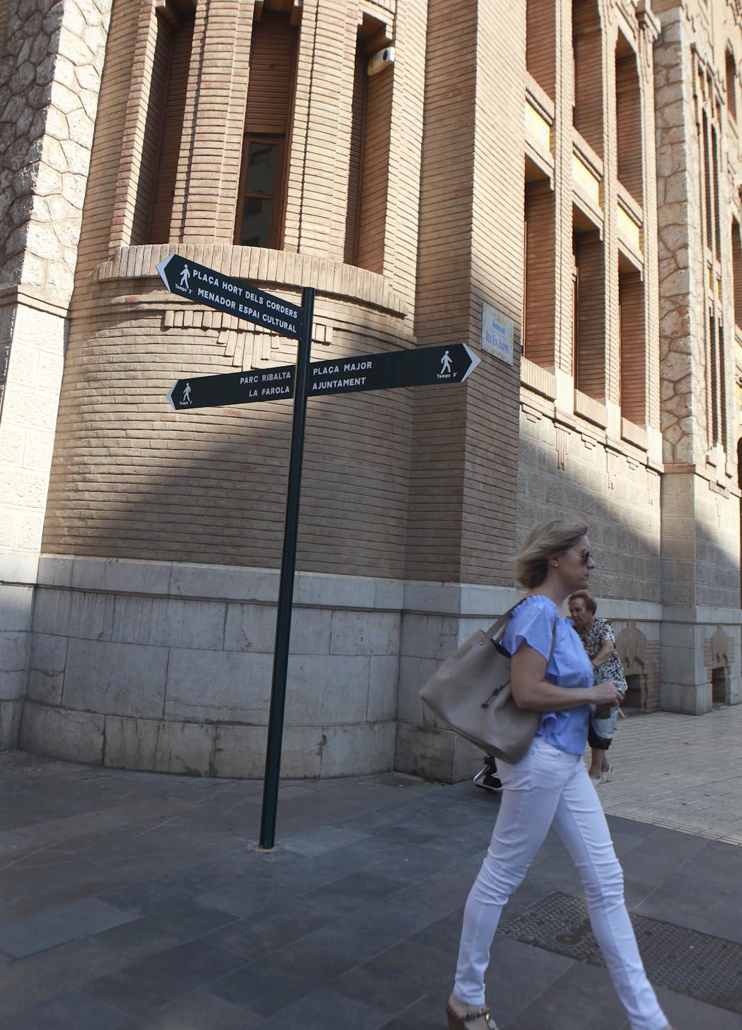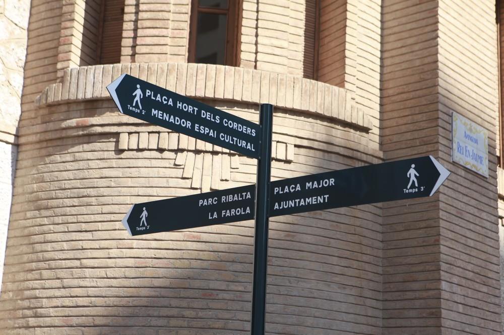 Un ejemplo es la señal que se encuentra en el paso de la plaza María Agustina a la calle Mayor, en la que se puede ver tres paneles informativos diferentes con las direcciones hacia la Plaza Mayor, el Ayuntamiento, el Mercado Central, la concatedral de Santa María, el Fadrí, la Casa dels Caragols, la Plaça de les Aules y el Palau de la Diputació, además de las distancias aproximadas en tiempo hasta ellos.