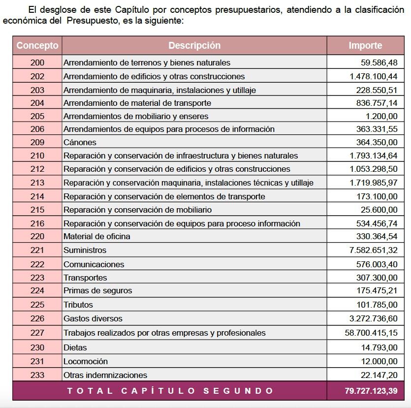 En lo que corresponde a los gastos municipales, la partida más abultada es la que hace referencia a los Gastos Corrientes y Servicios que presta la entidad municipal, que ascenderían a 79.727.123,39 euros. Este capítulo, según el informe económico que acompaña a las previsiones, conlleva una reducción del 0,86% sobre el presupuesto de 2018.