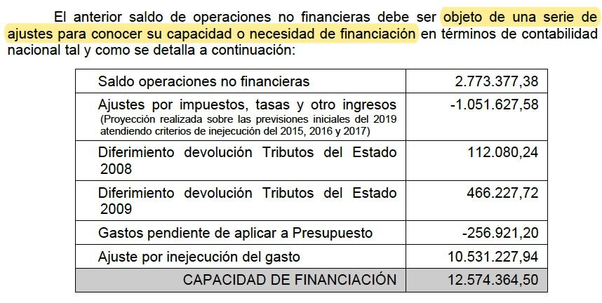 Cabe hacer referencia también a lo que indican los informes técnicos, y concretamente el Informe de Intervención, en el que se hace referencia a la necesidad de ajustes para conocer la capacidad real de financiación en términos de contabilidad.