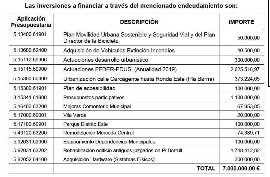 También deberán financiarse con cargo al préstamo, las aportaciones municipales de los proyectos Edusi de la anualidad de 2019. Cabe recordar que Los Fondos Europeos contemplan una serie de actuaciones valoradas en 20 millones de euros, pero con una financiación del 50% (10 millones de euros) por parte de Europa y otro 50% (10 millones de euros), que tendrán que ser aportados por el consistorio municipal. La anualidad del 2019 supone por parte del Ayuntamiento, una consignación de 2.625.519 euros.