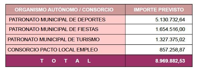 En este último apartado se integral presupuesto de los tres patronatos Municipales de Deportes, Turismo y fiestas, y el Consorcio del Pacto Local por el Empleo.