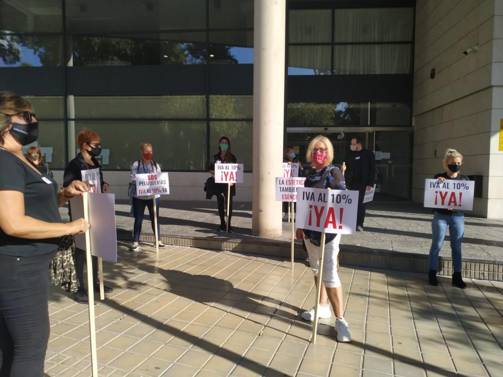 Los empresarios de salones de peluquerías y estética de la provincia de Castellón se han concentrado esta mañana frente a la delegación de Hacienda de Castellón para exigir al Gobierno central una rebaja del IVA hasta el 10%. La crisis por el coronavirus ha mermado la asistencia de clientes a estos establecimientos al no realizarse tantos eventos como antes ni con tanta afluencia de gente. Los peluqueros estiman que con la actual situación unas 200 peluquerías y centros de estética de la provincia, de los 1.600 que existen, se verán obligados a cerrar al no poder asumir los gastos