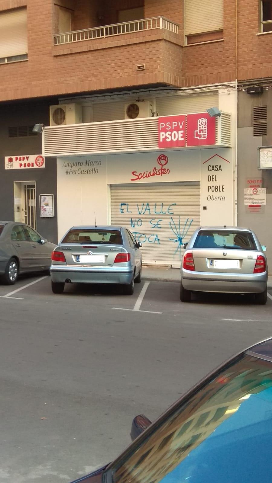 La sede del PSPV-PSOE de Castellón ha amanecido esta mañana con pintadas contra la decisión del Gobierno central de sacar los restos de Francisco Franco del Valle de los Caidos de Madrid. La secretaria de organización del PSPV-PSOE en la provincia de Castellón, Estíbaliz Pérez, ha condena “de forma rotunda” este ataque que “los nostálgicos del franquismo” han perpetrado durante la pasada madrugada contra la sede del partido en la ciudad de Castellón.