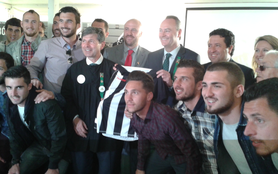 El Castellón alterna los entrenamientos y la puesta a punto para el partido de este viernes contra el Torrevieja en Castalia con los compromisos magdaleneros. Ahora que el viento sopla a favor, todos están con el equipo de la capital de la Plana. Este miércoles el presidente de la Generalitat Valenciana, el castellonense Alberto Fabra, visitó el 'Racó Albinegre'. Allí saludó a futbolistas, empleados y el presidente de la entidad, David Cruz. Como buen albinegro, deseó suerte al equipo en su lucha por el ascenso. Recibió una elástica con los colores del equipo.