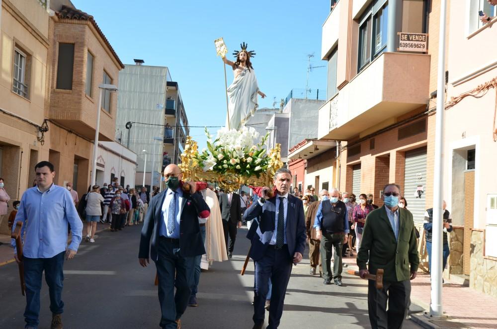 Pero antes, tal y como manda la tradición, los portadores de la imagen de la Virgen han realizado tres reverencias ante la talla de Cristo en señal de respeto. A este acto no han faltado la alcaldesa, Araceli de Moya, la concejala de Fiestas, Jennifer Casañ, así como varios miembros de la corporación municipal. La celebración de este Domingo de Resurrección se ha trasladado de nuevo a la parroquia de San Jaime, donde han entrado las dos imágenes tras el recorrido de vuelta. El párroco local, José Miguel Sala, ha sido el encargado de oficiar la misa de Pascua.
