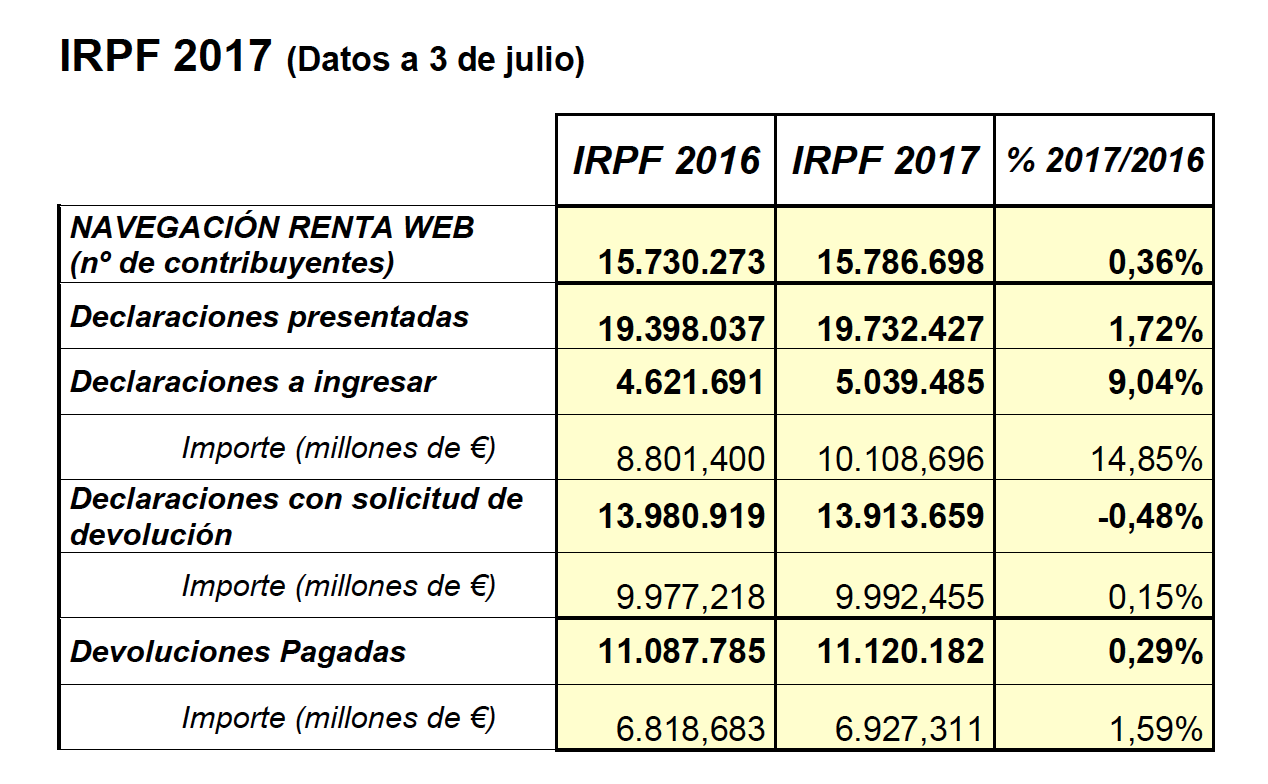 Hasta el día de ayer, la Agencia había registrado 19.732.000 declaraciones del Impuesto sobre la Renta, 334.000 más que en la campaña anterior en las mismas fechas. Las declaraciones con solicitud de devolución han sumado un total de 13.913.000, el 70% del total.