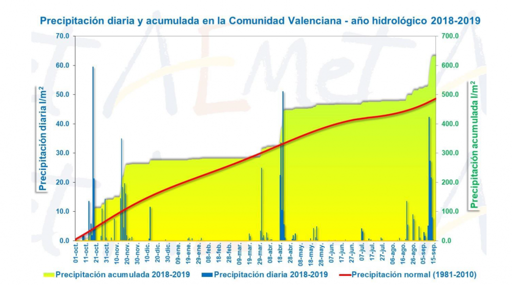 Hasta el 17 de septiembre, el año hidrológico 2018-2019 que comenzó el 1 de octubre de 2018, está teniendo un carácter húmedo en la Comunidad Valenciana, con una precipitación media que es un 30% superior a la del promedio climático del periodo 1981-2010. Hasta el 17 de septiembre se han acumulado 632.1 l/m2, cuando lo normal en este periodos es 486.3 l/m2.