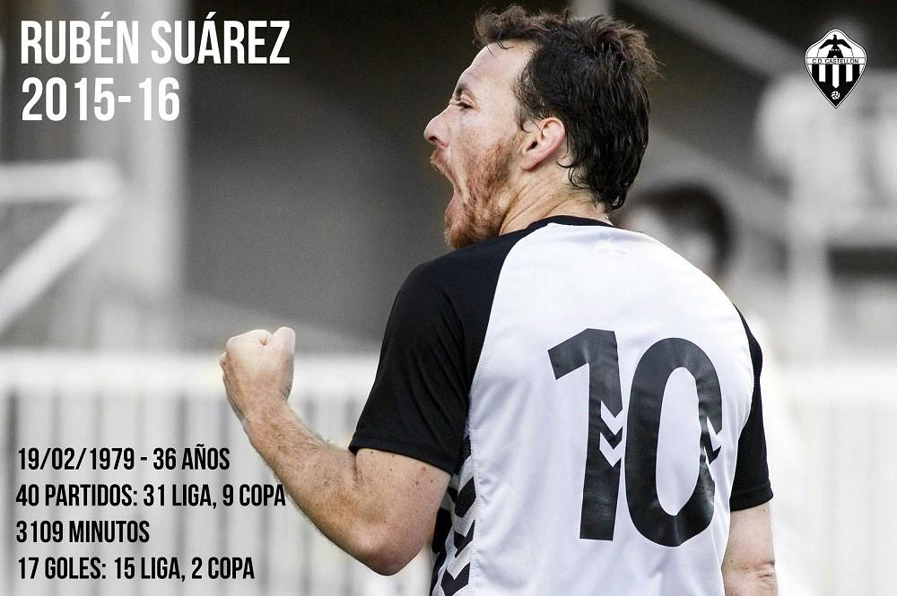 El Castellón 2015-16 va tomando cuerpo. Este viernes el club que preside David Cruz anunció la renovación de tres nuevos jugadores, y entre ellos está uno de los pesos pesados del equipo como es el extremo zurdo o mediapunta asturiano Rubén Suárez, máximo realizador del equipo albinegro esta recién finalizada campaña (15 dianas). El veterano futbolista, de 36 años, se une a otros cuatro integrantes de la plantilla 2014-15 que también han estampado su firma por una temporada más: el portero Álvaro Campos y el mediocentro Marc Castells, que lo hicieron este viernes, y el jueves lo hicieron Diego Carrillo y Guille Vázquez.