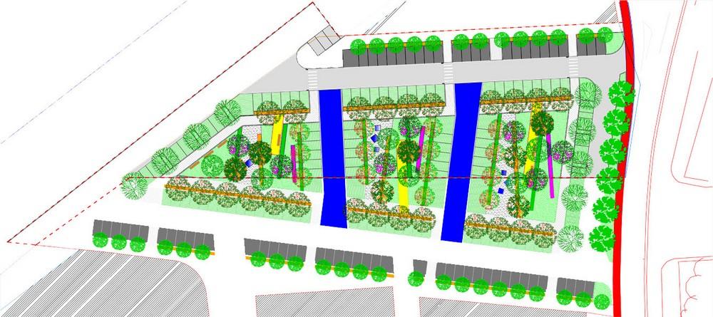 El proyecto incluye la construcción de un vial de doble dirección que recorre el perímetro de la zona verde y contiene plazas de aparcamiento a sus dos lados, a la vez que se introducen dos viales que atraviesan transversalmente la zona ajardinada en direcciones perpendiculares a sus lindes, generando dos ejes que contienen también aparcamientos y acotan tres zonas ajardinadas en las que se priorizará el uso de especies autóctonas. Además, también se construirán las correspondientes aceras perimetrales y se ubicarán fuentes ornamentales para mejorar el uso público de la zona ajardinada.